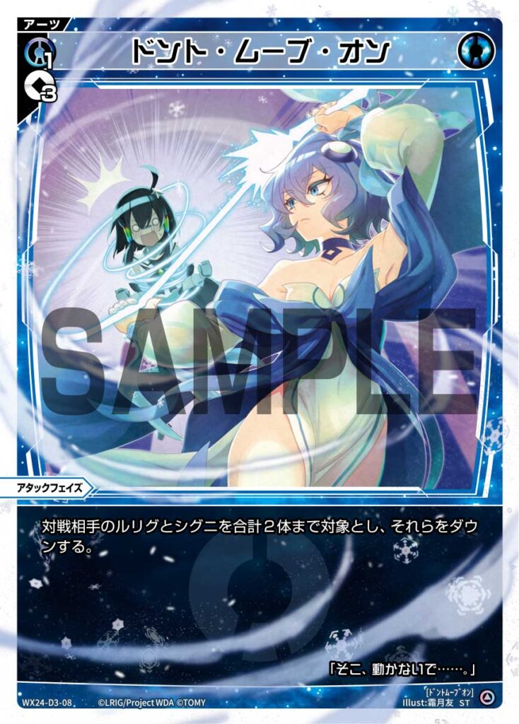 ドント・ムーブ・オン アーツ 2025.11.21 WX24-D3-08<ドントムーブオン> 対戦相手のルリグとシグニを合計2体まで対象とし、それらをダウンする。 Q&A Q:このアーツの効果で、対戦相手のシグニ2体やルリグ2体を対象にできますか? A:はい、可能です。 引用元:公式サイト