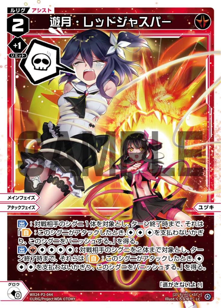 【出】《赤》《無》《無》《無》《無》:対戦相手のシグニを2体まで対象とし、ターン終了時まで、それらは「【自】:このシグニがアタックしたとき、《無》《無》《無》を支払わないかぎり、このシグニをバニッシュする。」を得る。