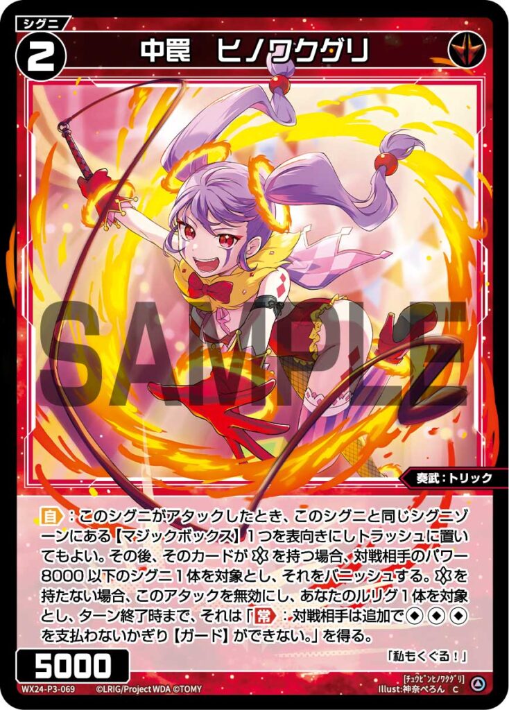 【自】:このシグニがアタックしたとき、このシグニと同じシグニゾーンにある【マジックボックス】1つを表向きにしトラッシュに置いてもよい。