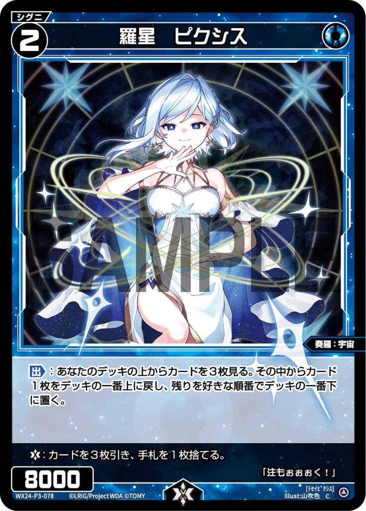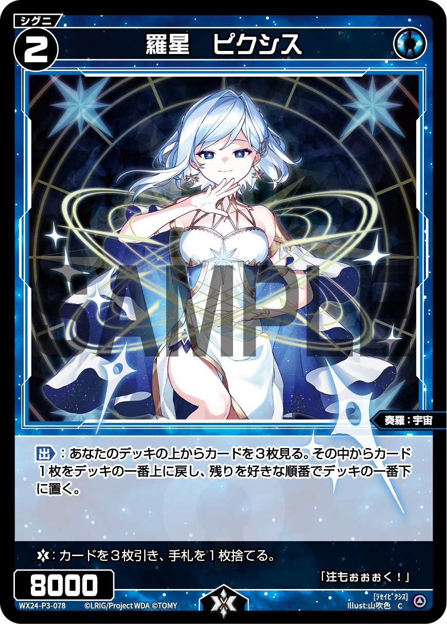 羅星 ピクシス シグニ 2025.11.20 WX24-P3-078<ラセイピクシス> 【出】:あなたのデッキの上からカードを3枚見る。その中からカード1枚をデッキの一番上に戻し、残りを好きな順番でデッキの一番下に置く。ライフバースト:カードを3枚引き、手札を1枚捨てる。 Q&A Q:この出現時能力で、1枚もデッキの上に置かずに3枚すべてをデッキの一番下に置くことはできますか? A:いいえ、できません。必ず1枚をデッキの一番上に置きます。 引用元:公式サイト