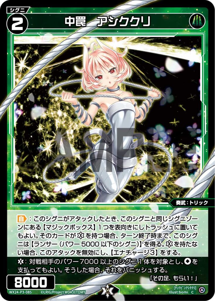 【自】:このシグニがアタックしたとき、このシグニと同じシグニゾーンにある【マジックボックス】1つを表向きにしトラッシュに置いてもよい。