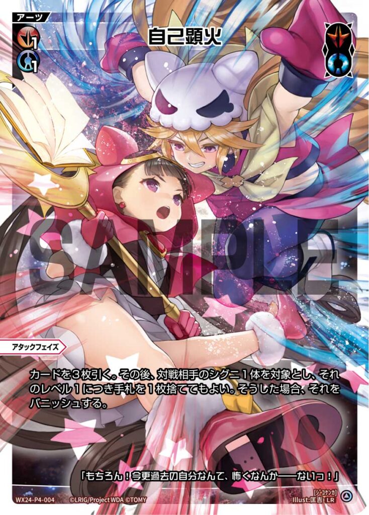 自己顕火 アーツ 2025.11.19 WX24-P4-004<ジコケンカ> カードを3枚引く。その後、対戦相手のシグニ1体を対象とし、それのレベル1につき手札を1枚捨ててもよい。そうした場合、それをバニッシュする。 Q&A Q:カードを3枚引いて、その内容を見てから対戦相手のシグニを対象にできますか? A:はい、この効果ではまずカードを3枚引き、その後に対戦相手のシグニ1体を対象にします。 引用元:公式サイト
