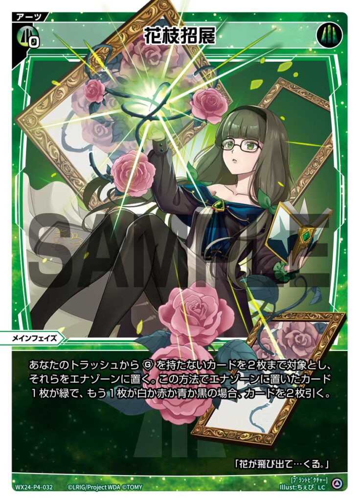 この方法でエナゾーンに置いたカード1枚が緑で、もう1枚が白か赤か青か黒の場合、カードを2枚引く。