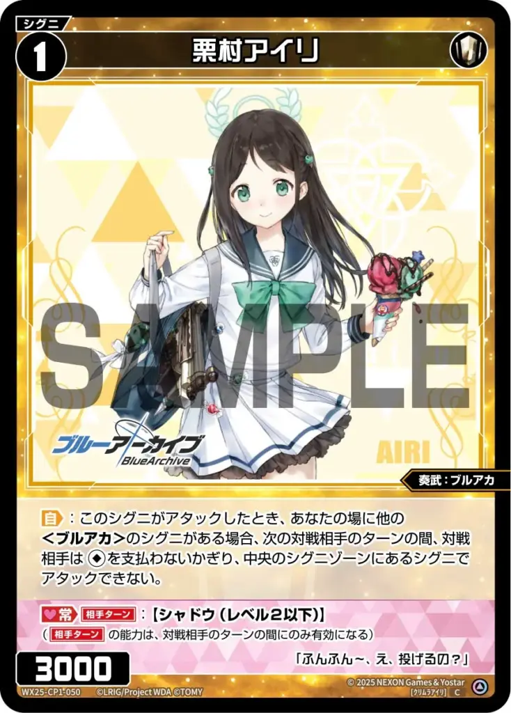 【自】:このシグニがアタックしたとき、あなたの場に他の<ブルアカ>のシグニがある場合、次の対戦相手のターンの間、対戦相手は《無》を支払わないかぎり、中央のシグニゾーンにあるシグニでアタックできない。