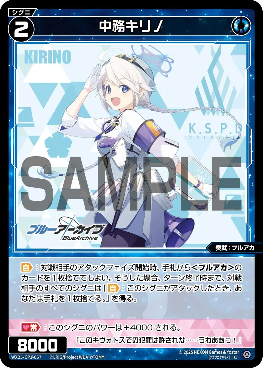 【自】:対戦相手のアタックフェイズ開始時、手札から<ブルアカ>のカードを1枚捨ててもよい。