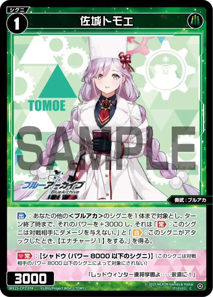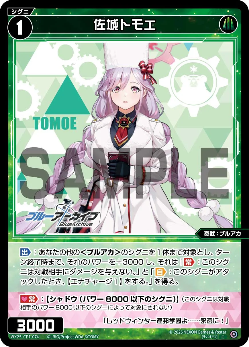 【出】:あなたの他の<ブルアカ>のシグニを1体まで対象とし、ターン終了時まで、それのパワーを+3000し、それは「【常】:このシグニは対戦相手にダメージを与えない。」と「【自】:このシグニがアタックしたとき、【エナチャージ1】をする。」を得る。