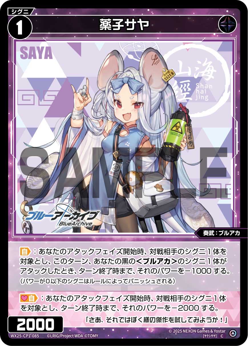 【自】:あなたのアタックフェイズ開始時、対戦相手のシグニ1体を対象とし、このターン、あなたの黒の<ブルアカ>のシグニ1体がアタックしたとき、ターン終了時まで、それのパワーを-1000する。