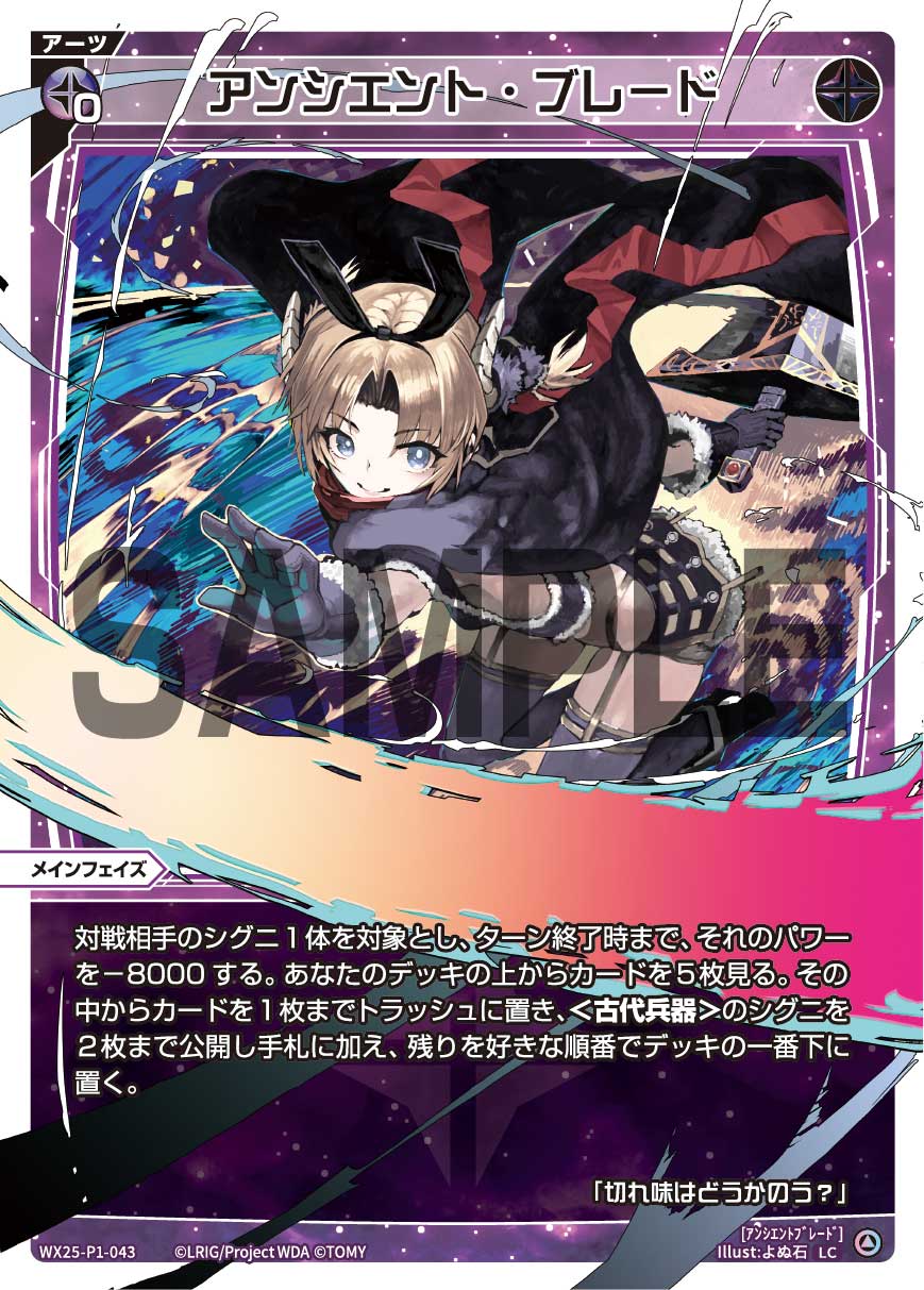 その中からカードを1枚までトラッシュに置き、<古代兵器>のシグニを2枚まで公開し手札に加え、残りを好きな順番でデッキの一番下に置く。