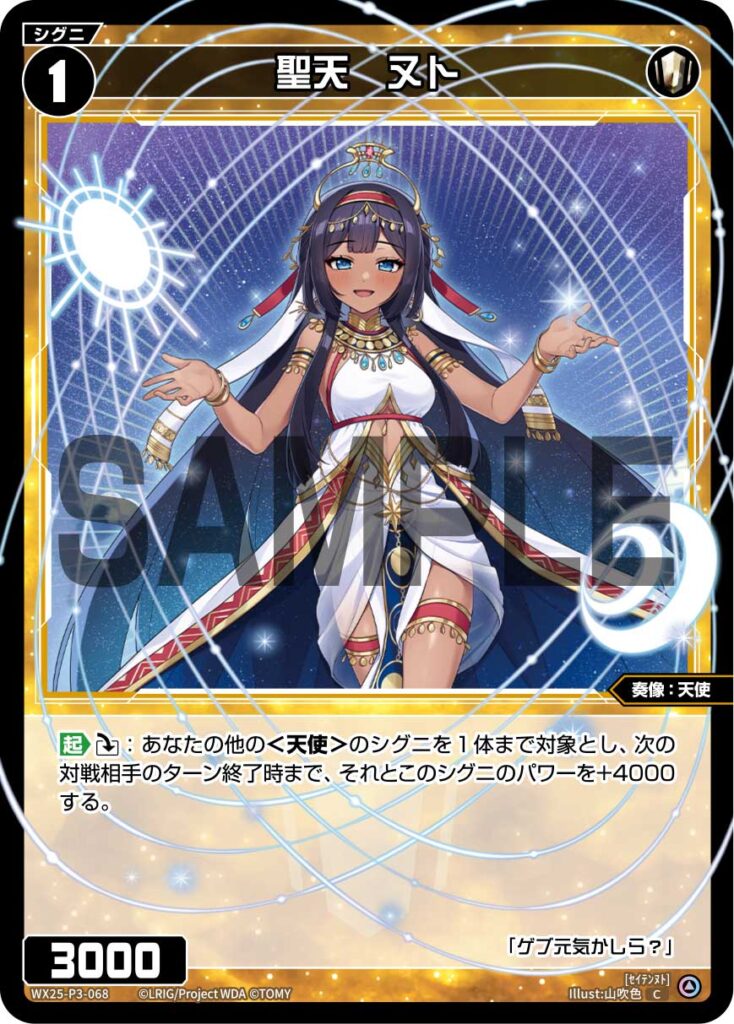 聖天 ヌト シグニ 2026.01.27 WX25-P3-068<セイテンヌト> 【起】《ダウン》:あなたの他の<天使>のシグニを1体まで対象とし、次の対戦相手のターン終了時まで、それとこのシグニのパワーを+4000する。 Q&A Q:場にこのシグニが1体のみの状況でも、対象を選ばずにこのシグニだけを+4000できますか? A:はい、できます。 引用元:公式サイト