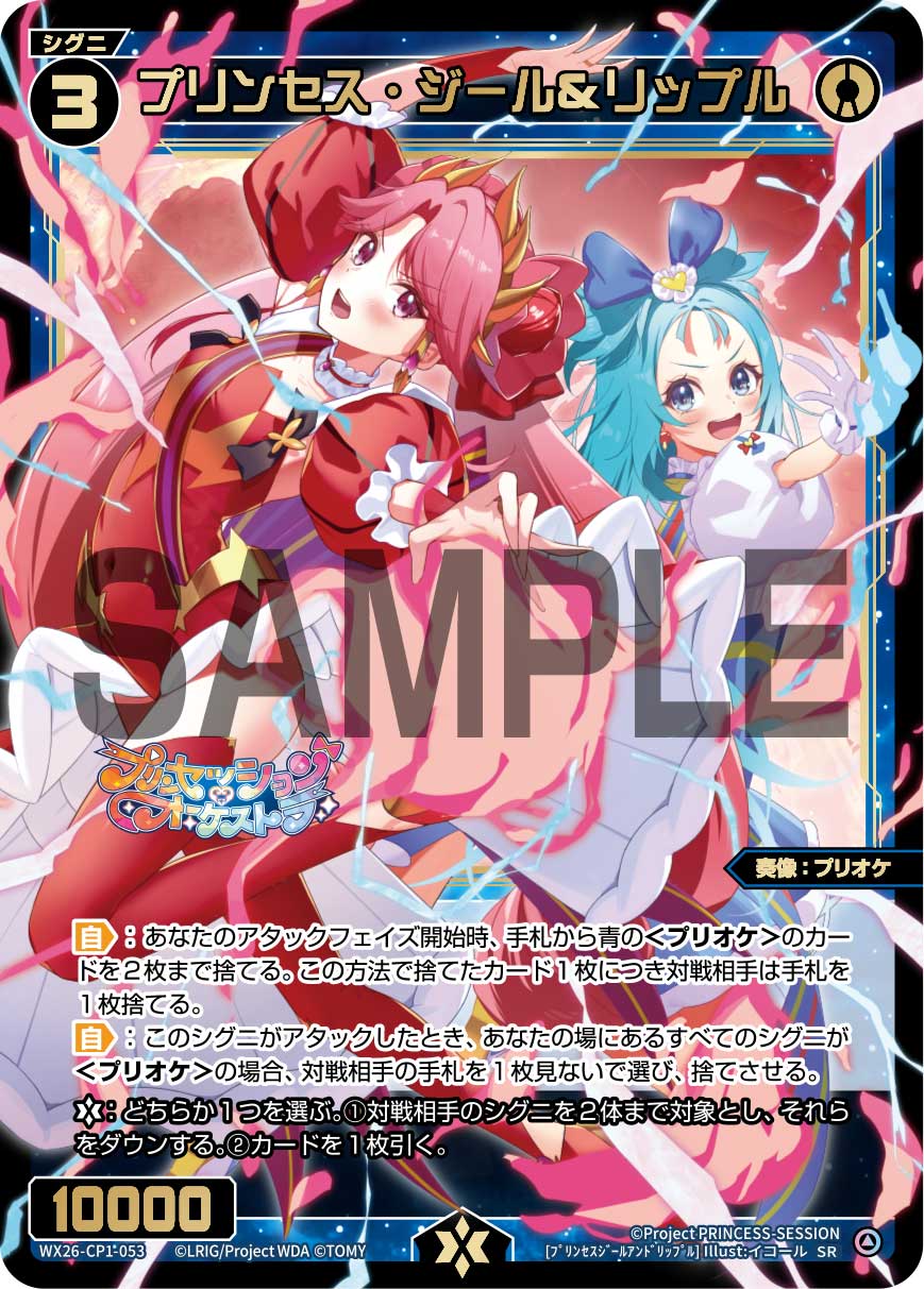 【自】:あなたのアタックフェイズ開始時、手札から青の<プリオケ>のカードを2枚まで捨てる。