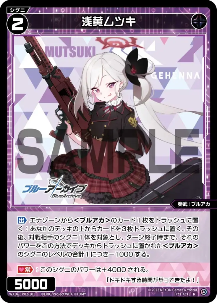 その後、対戦相手のシグニ1体を対象とし、ターン終了時まで、それのパワーをこの方法でデッキからトラッシュに置かれた<ブルアカ>のシグニのレベルの合計1につき-1000する。