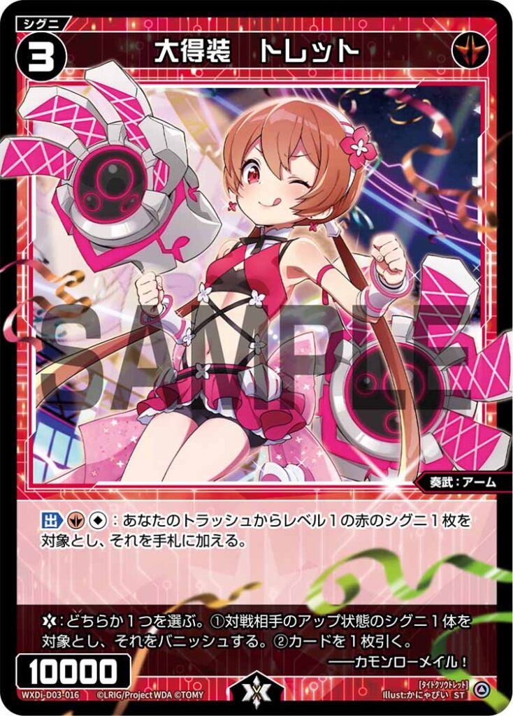 【出】《赤》《無》:あなたのトラッシュからレベル1の赤のシグニ1枚を対象とし、それを手札に加える。