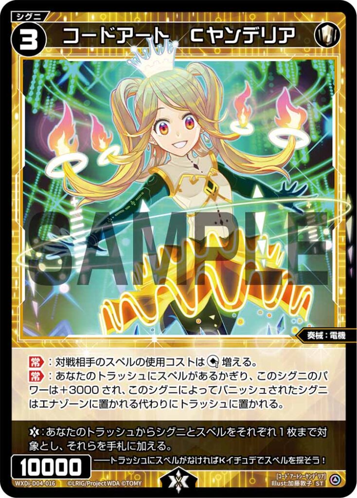 Q:トラッシュにスペルがある状態の《コードアート Cヤンデリア》に《中装 ショクダイキリ》で自動能力を付与しました。