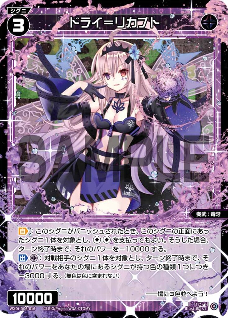 【出】《黒》:対戦相手のシグニ1体を対象とし、ターン終了時まで、それのパワーをあなたの場にあるシグニが持つ色の種類1つにつき-3000する。(無色は色に含まれない)