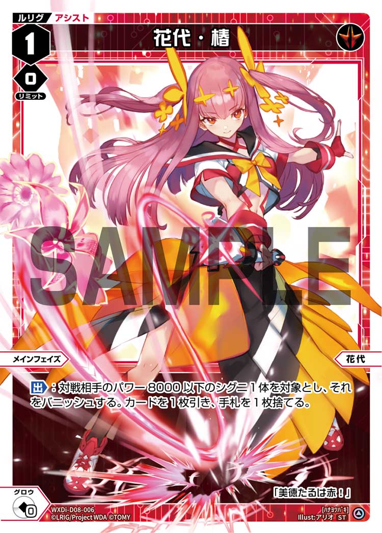 花代・椿 アシスト 2025.12.02 WXDi-D08-006<ハナヨツバキ> 【出】:対戦相手のパワー8000以下のシグニ1体を対象とし、それをバニッシュする。カードを1枚引き、手札を1枚捨てる。 Q&A Q:対戦相手の場にシグニがなくても、カードを1枚引くことはできますか? A:はい、できます。対戦相手のシグニをバニッシュできなくても後半の効果は処理されます。 引用元:公式サイト