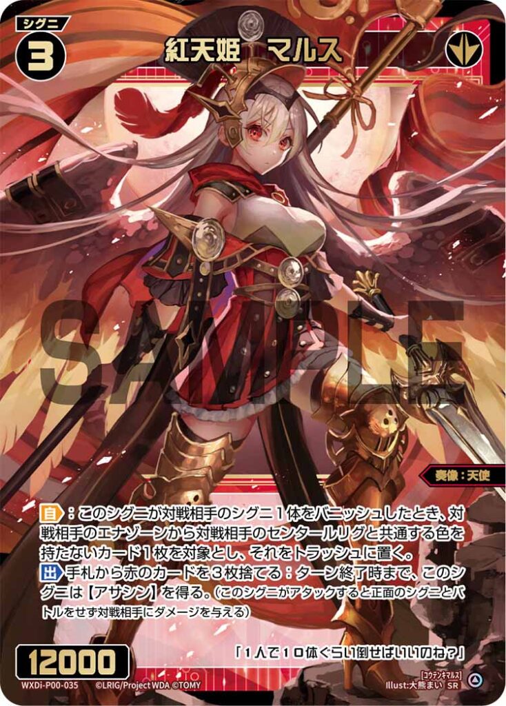 【出】手札から赤のカードを3枚捨てる:ターン終了時まで、このシグニは【アサシン】を得る。(このシグニがアタックすると正面のシグニとバトルをせず対戦相手にダメージを与える)