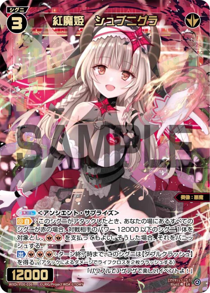 【出】《赤》《赤》《赤》:ターン終了時まで、このシグニは【ダブルクラッシュ】を得る。(アタックによるダメージでライフクロスを2枚クラッシュする)