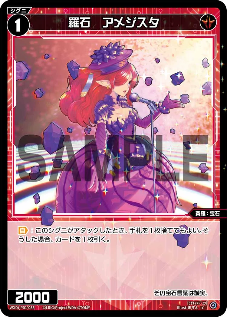 羅石 アメジスタ シグニ 2025.12.03 WXDi-P01-055<ラセキアメジスタ> 【自】:このシグニがアタックしたとき、手札を1枚捨ててもよい。そうした場合、カードを1枚引く。 Q&A Q:自分の手札がないときにこのシグニがアタックし、自動能力が発動しました。どうなりますか? A:その場合、手札を捨てることができませんので、そうした場合以降の効果は発生しません。 引用元:公式サイト