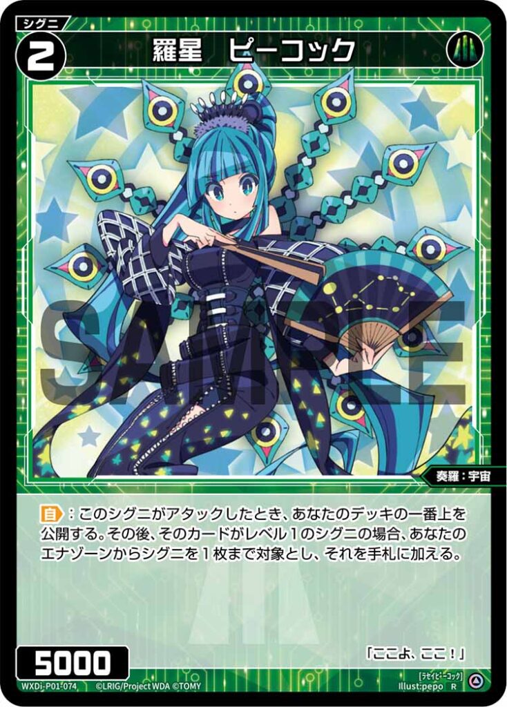 羅星 ピーコック シグニ 2025.12.03 WXDi-P01-074<ラセイピーコック> 【自】:このシグニがアタックしたとき、あなたのデッキの一番上を公開する。その後、そのカードがレベル1のシグニの場合、あなたのエナゾーンからシグニを1枚まで対象とし、それを手札に加える。 Q&A Q:公開したデッキの一番上のカードはどうなりますか? A:それが条件に合うカードかどうかに関わらず、効果終了後にそのカードはデッキの一番上に裏向きに戻します。 引用元:公式サイト