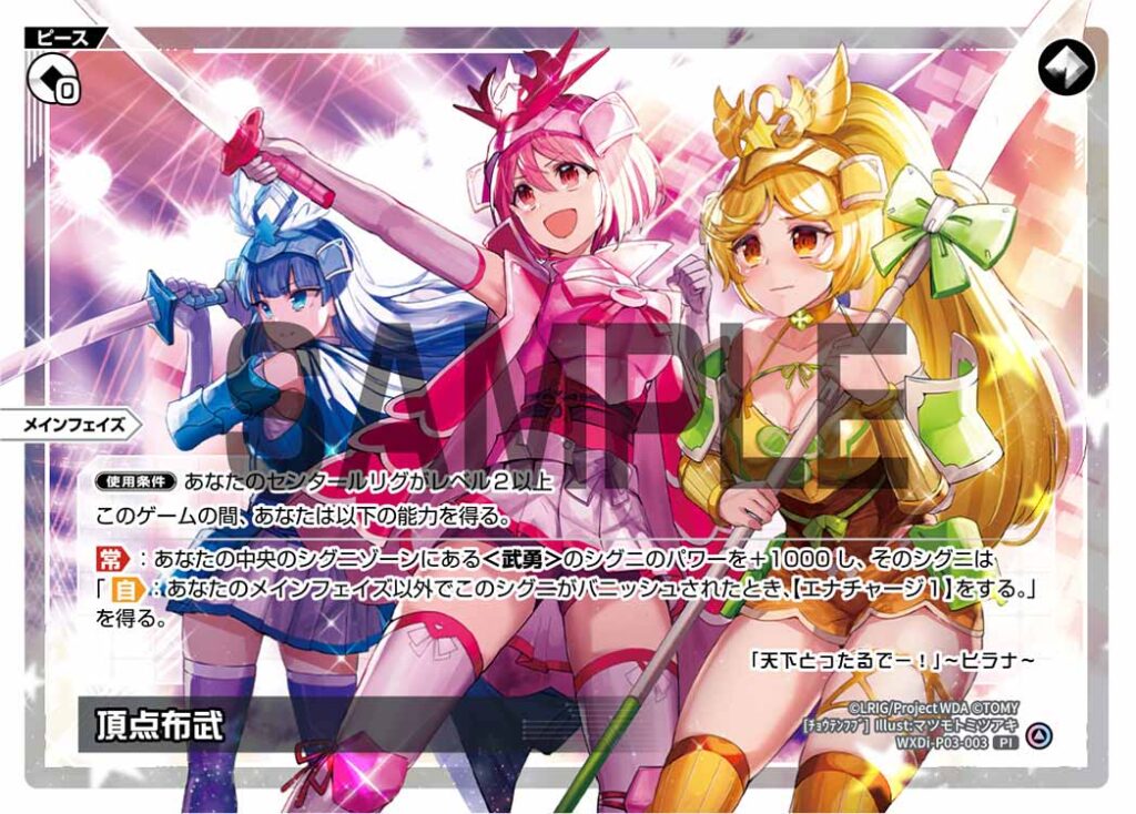 『【常】:あなたの中央のシグニゾーンにある<武勇>のシグニのパワーを+1000し、そのシグニは「【自】:あなたのメインフェイズ以外でこのシグニがバニッシュされたとき、【エナチャージ1】をする。」を得る。』
