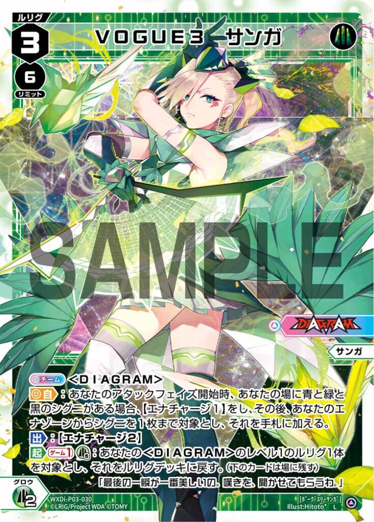【起】《ゲーム1回》《緑×0》:あなたの<DIAGRAM>のレベル1のルリグ1体を対象とし、それをルリグデッキに戻す。(下のカードは場に残す)