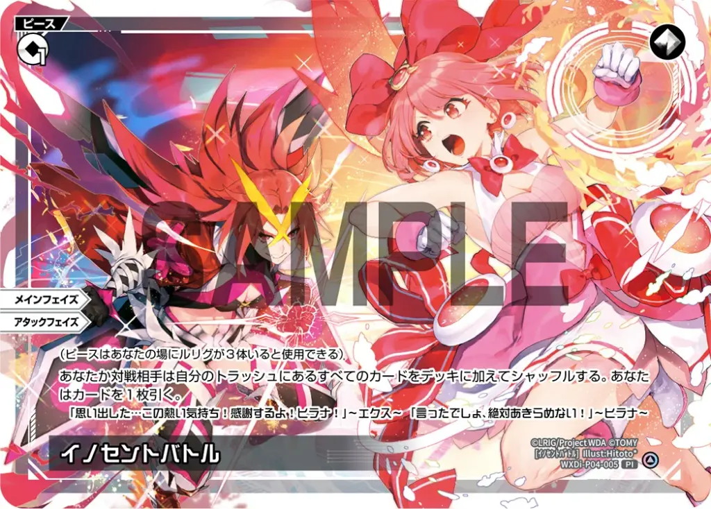 イノセントバトル ピース 2025.12.03 WXDi-P04-005<イノセントバトル> (ピースはあなたの場にルリグが3体いると使用できる) あなたか対戦相手は自分のトラッシュにあるすべてのカードをデッキに加えてシャッフルする。あなたはカードを1枚引く。 Q&A Q:トラッシュにあるすべてのカードをデッキに加えてシャッフルするのがどちらのプレイヤーかを選ぶのは誰ですか? A:このピースを使用したプレイヤーが選びます。 引用元:公式サイト
