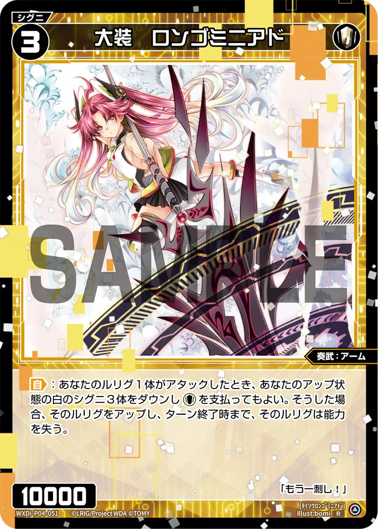 Q:場に「アタックしたときにアップする」能力を持っているルリグと、《大装 ロンゴミニアド》を含む白のシグニが3体居ます。