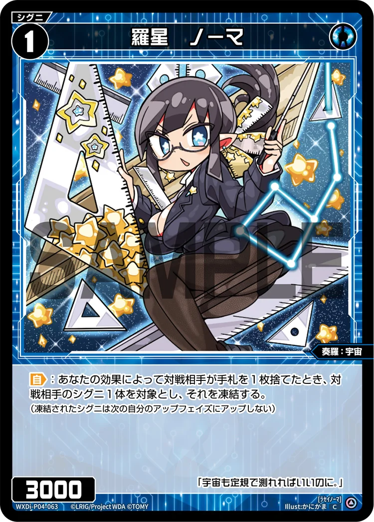 羅星 ノーマ シグニ 2025.12.03 WXDi-P04-063<ラセイノーマ> 【自】:あなたの効果によって対戦相手が手札を1枚捨てたとき、対戦相手のシグニ1体を対象とし、それを凍結する。(凍結されたシグニは次の自分のアップフェイズにアップしない) Q&A Q:対戦相手の手札を2枚捨てさせる効果を使用した場合、この自動能力は発動しますか? A:はい、2枚捨てた場合は2回トリガーし、2回発動します。 引用元:公式サイト