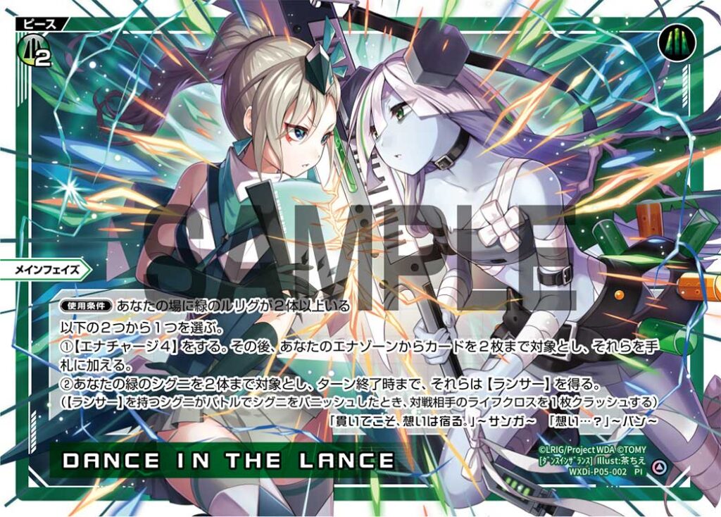 ②あなたの緑のシグニを2体まで対象とし、ターン終了時まで、それらは【ランサー】を得る。
