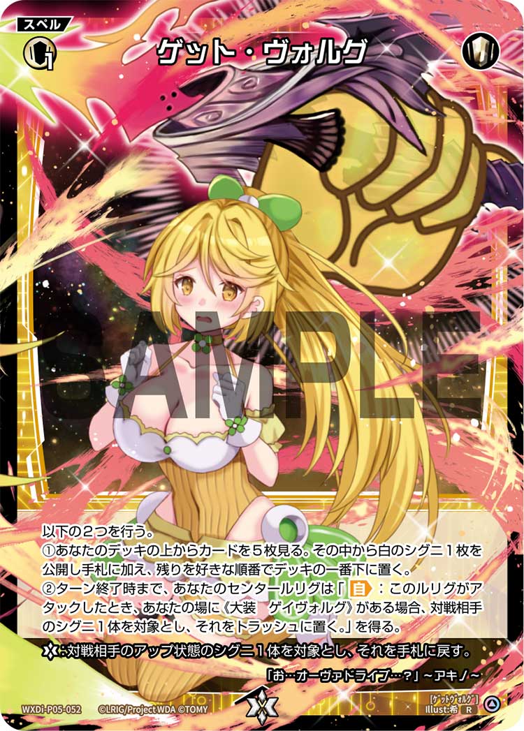 ②ターン終了時まで、あなたのセンタールリグは「【自】:このルリグがアタックしたとき、あなたの場に《大装 ゲイヴォルグ》がある場合、対戦相手のシグニ1体を対象とし、それをトラッシュに置く。」を得る。