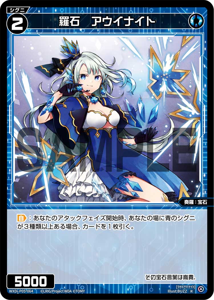 羅石 アウイナイト シグニ 2025.12.02 WXDi-P05-064<ラセキアウイナイト> 【自】:あなたのアタックフェイズ開始時、あなたの場に青のシグニが3種類以上ある場合、カードを1枚引く。 Q&A Q:青のシグニが3種類、という条件は具体的に何を確認すればよいですか? A:カード名が違う青のシグニが3種類以上あれば、《羅石 アウイナイト》の自動能力でカードを1枚引きます。 引用元:公式サイト