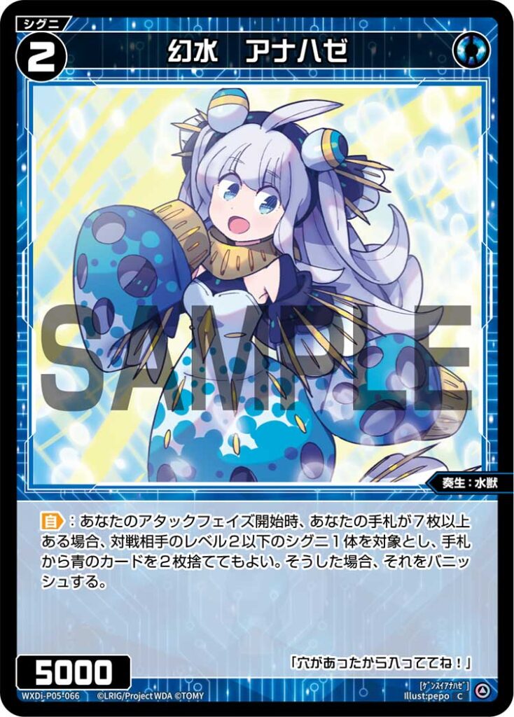 1体目の《幻水 アナハゼ》の能力を発動し、手札から青のカードを2枚捨てた場合、2体目の《幻水 アナハゼ》の能力の発動時には手札が5枚ですので、2体目の効果では何も起こりません。