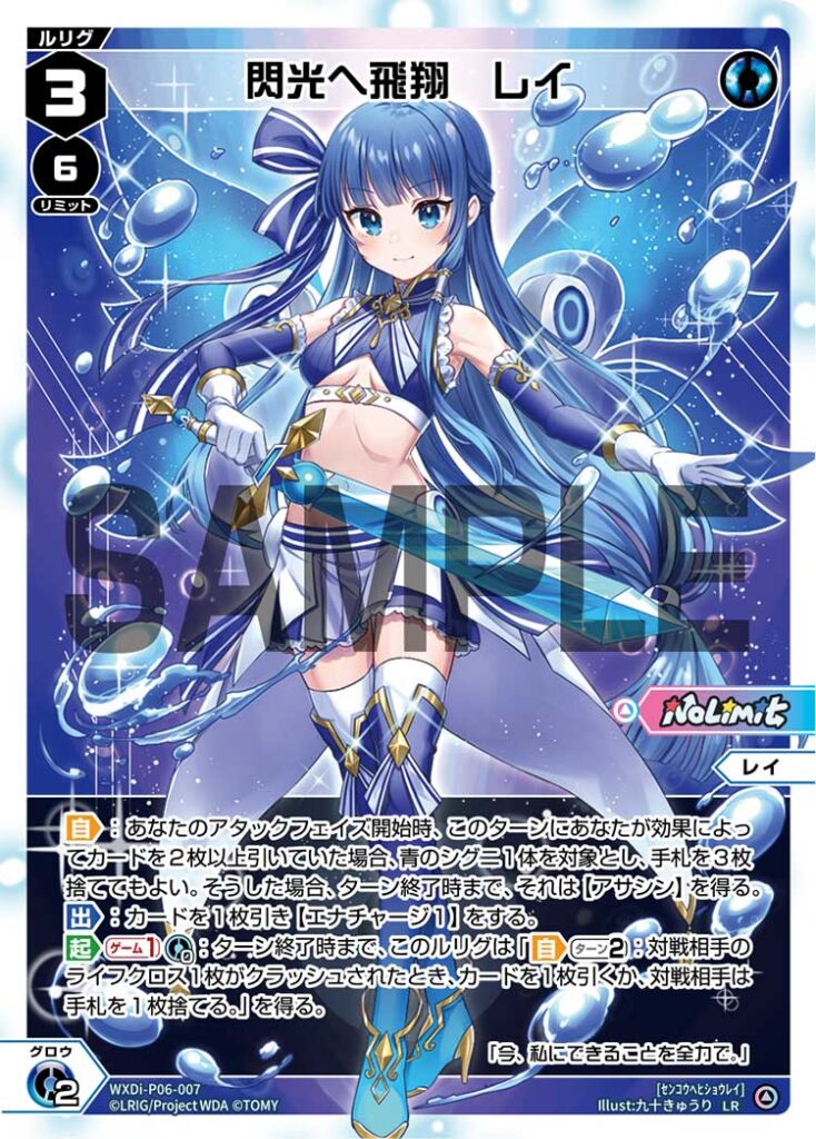 【起】《ゲーム1回》《青×0》:ターン終了時まで、このルリグは「【自】《ターン2回》:対戦相手のライフクロス1枚がクラッシュされたとき、カードを1枚引くか、対戦相手は手札を1枚捨てる。」を得る。