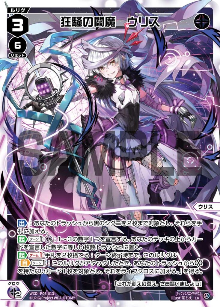 【出】:あなたのトラッシュから黒のシグニを2枚まで対象とし、それらを手札に加える。