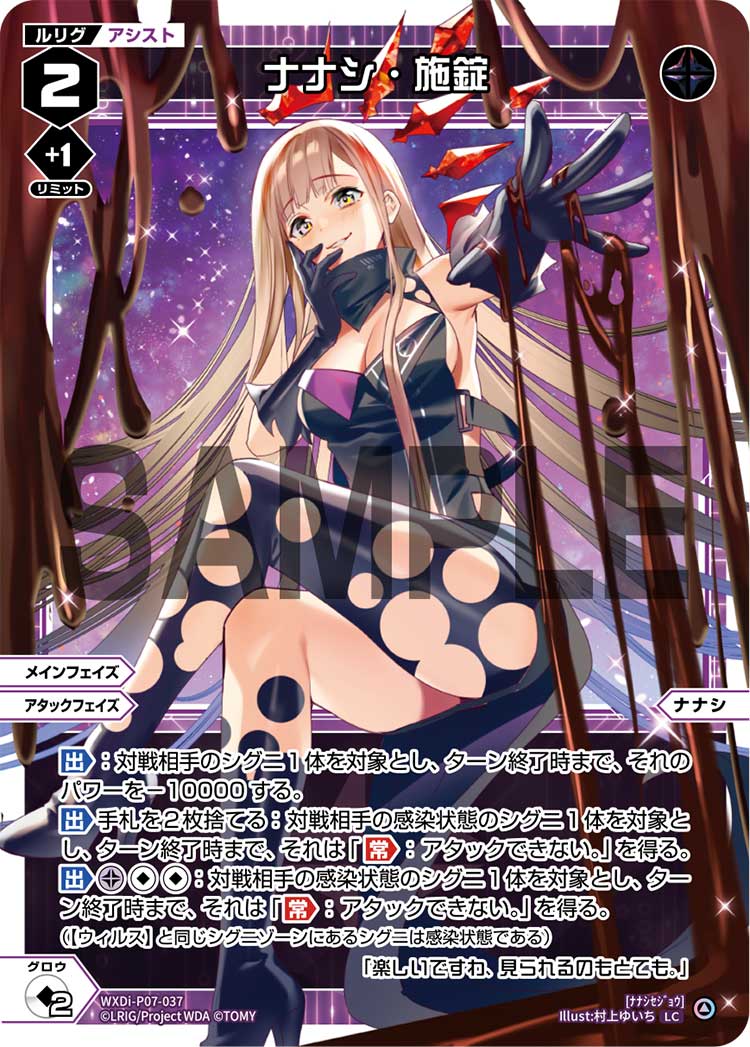 【出】《黒》《無》《無》:対戦相手の感染状態のシグニ1体を対象とし、ターン終了時まで、それは「【常】:アタックできない。」を得る。