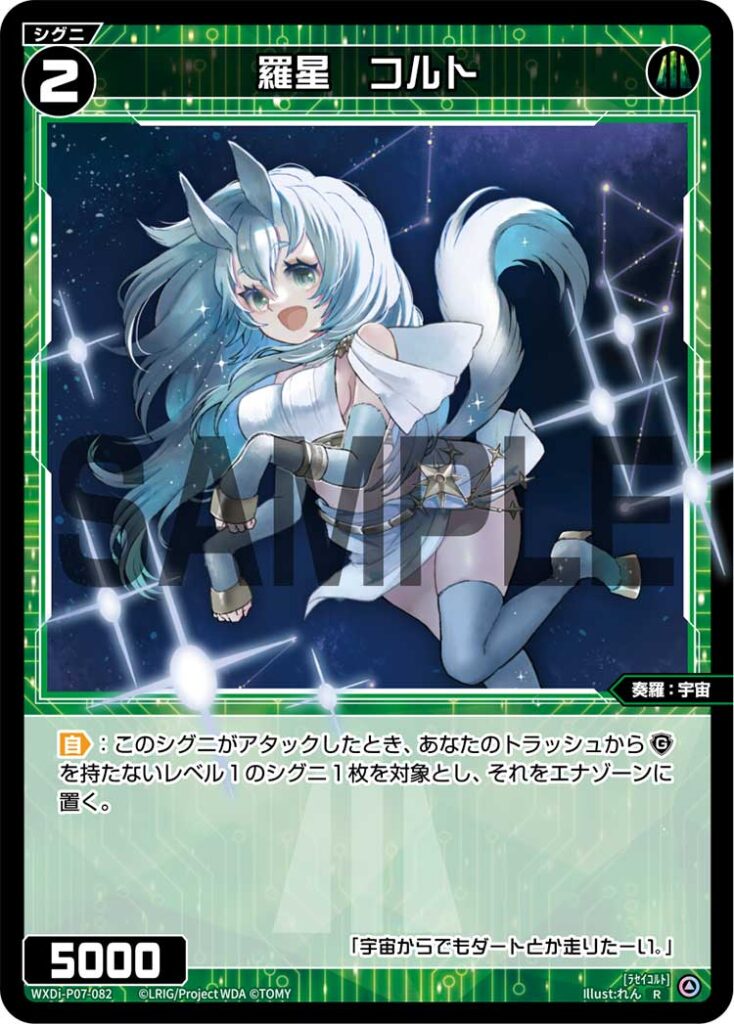 羅星 コルト シグニ 2025.12.02 WXDi-P07-082<ラセイコルト> 【自】:このシグニがアタックしたとき、あなたのトラッシュから《ガードアイコン》を持たないレベル1のシグニ1枚を対象とし、それをエナゾーンに置く。 Q&A Q:この能力が発動したとき、トラッシュからエナゾーンにシグニを置くのは強制ですか? A:はい、対象となるシグニがあるなら強制となります。 引用元:公式サイト