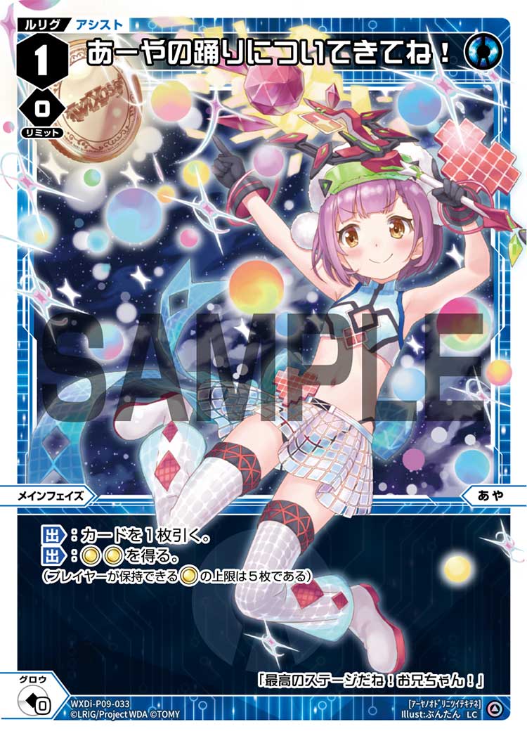 あーやの踊りについてきてね! アシスト 2025.11.28 WXDi-P09-033<アーヤノオドリニツイテキテネ> 【出】:カードを1枚引く。【出】:《コインアイコン》《コインアイコン》を得る。(プレイヤーが保持できる《コインアイコン》の上限は5枚である) Q&A Q:コインを4枚持っているときに、出現時能力でコインを得られますか? A:はい、その場合は1枚のみ得て5枚となります。 引用元:公式サイト