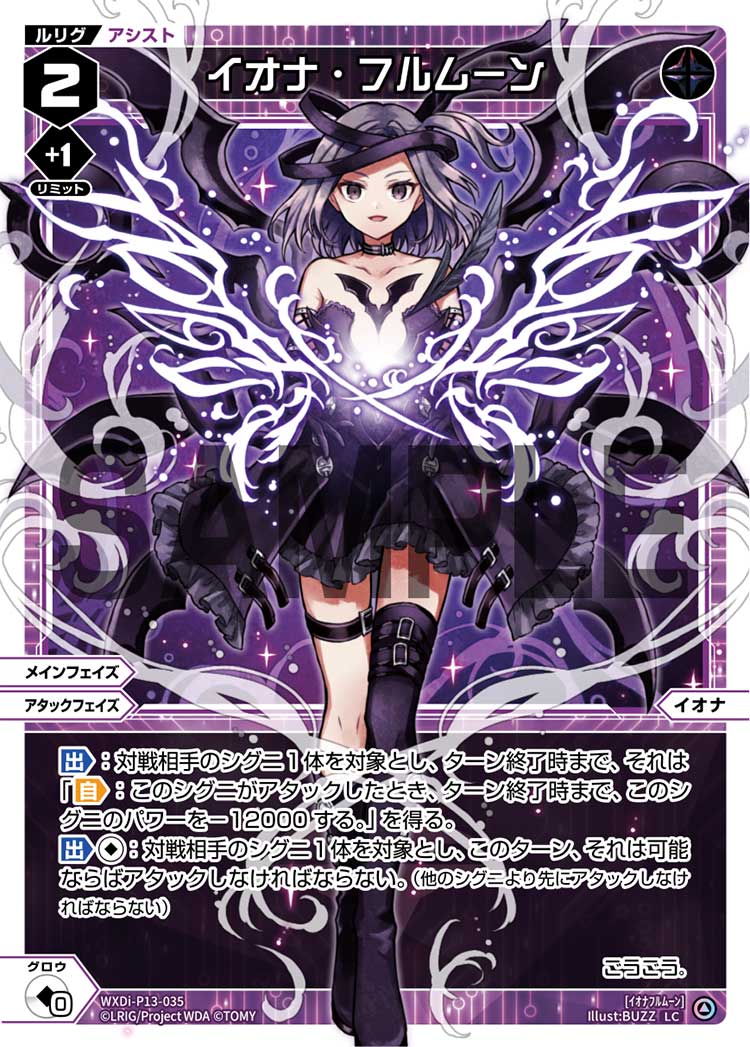 【出】:対戦相手のシグニ1体を対象とし、ターン終了時まで、それは「【自】:このシグニがアタックしたとき、ターン終了時まで、このシグニのパワーを-12000する。」を得る。