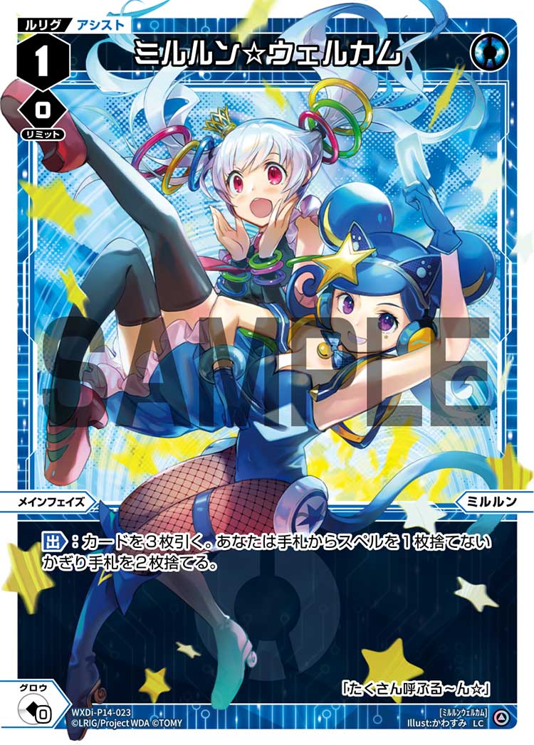 ミルルン☆ウェルカム アシスト 2025.11.27 WXDi-P14-023<ミルルンウェルカム> 【出】:カードを3枚引く。あなたは手札からスペルを1枚捨てないかぎり手札を2枚捨てる。 Q&A Q:この効果で、スペルを含む2枚を捨てることはできますか? A:はい、スペルが含まれていたとしても2枚捨てることを選ぶことができます。 引用元:公式サイト