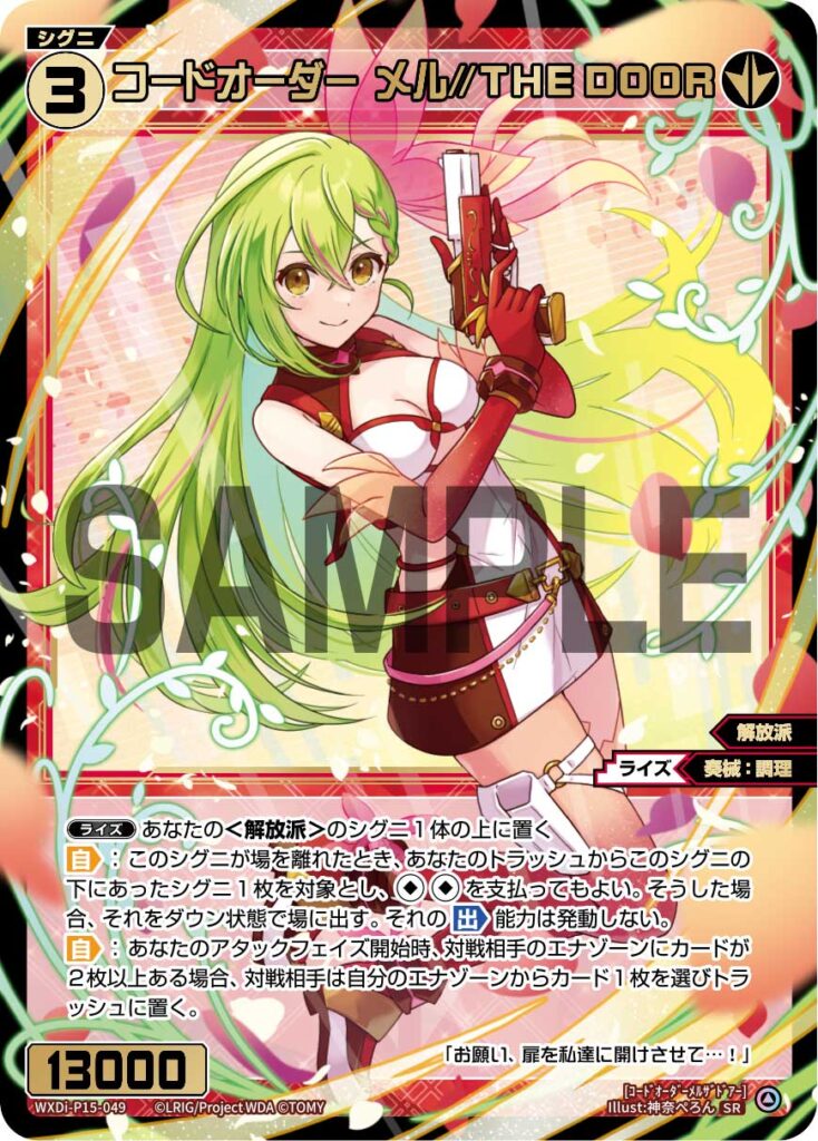 【自】:このシグニが場を離れたとき、あなたのトラッシュからこのシグニの下にあったシグニ1枚を対象とし、《無》《無》を支払ってもよい。