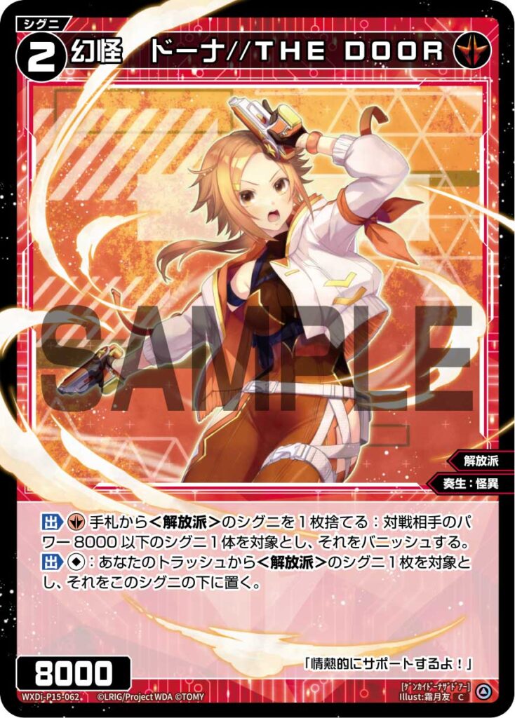 【出】《赤》手札から<解放派>のシグニを1枚捨てる:対戦相手のパワー8000以下のシグニ1体を対象とし、それをバニッシュする。
