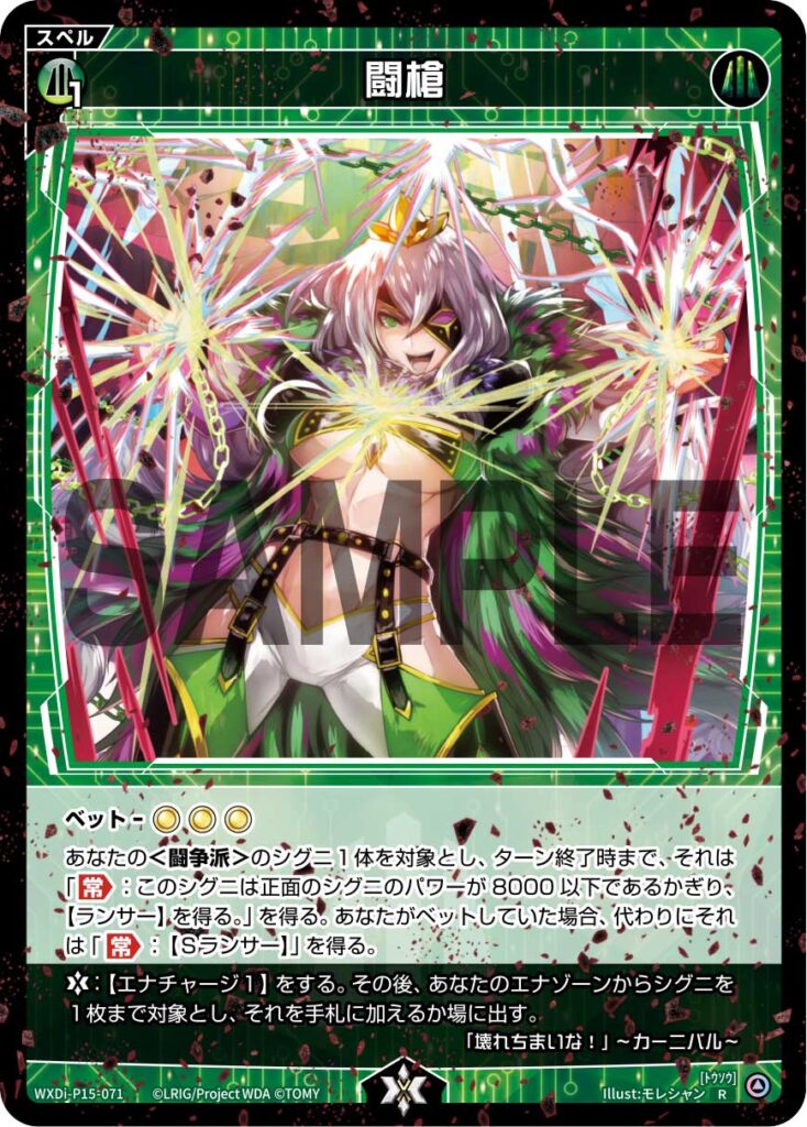 あなたの<闘争派>のシグニ1体を対象とし、ターン終了時まで、それは「【常】:このシグニは正面のシグニのパワーが8000以下であるかぎり、【ランサー】を得る。」を得る。